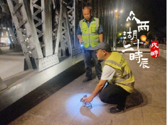 夜幕降臨,兩湖燈光漸次亮起,城市燈火通明,市民漫步其間,享受閑暇時光。此時夜巡組正檢查護欄與照明設施。他們標記下破損的路燈編號,為城市夜景中筑起一道安心的屏障。