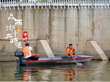 下午2點,陽光正烈,湖面作業船的馬達聲劃破城市寧靜。兩湖水體運維人員葉雨和李輝駕駛打撈船,清理湖面漂浮的水草和垃圾,確保水域干凈透亮。