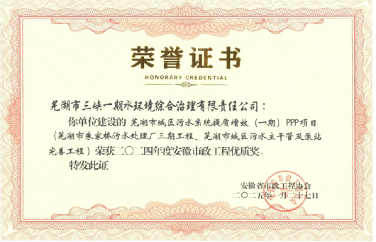 “安徽市政工程優(yōu)質(zhì)獎(jiǎng)”是安徽省市政工程質(zhì)量最高獎(jiǎng)。蕪湖市城區(qū)污水系統(tǒng)提質(zhì)增效(一期)項(xiàng)目是長江環(huán)保集團(tuán)深度參與“共抓長江大保護(hù)”的首批重點(diǎn)項(xiàng)目,該項(xiàng)目由蕪湖市三峽一期水環(huán)境綜合治理有限責(zé)任公司投資建設(shè),項(xiàng)目擴(kuò)建一座日處理11.5萬立方米的污水處理廠,新建12.4千米污水主干管和2座污水泵站,主要服務(wù)蕪湖市鳩江區(qū)、鏡湖區(qū)等主城區(qū),總面積約99平方千米,服務(wù)人口90萬人,項(xiàng)目以“‘廠-網(wǎng)-河-湖-岸’一體化治理、建設(shè)養(yǎng)護(hù)全周期、系統(tǒng)治理、標(biāo)本兼治”為主線,通過完善管網(wǎng)工程,推進(jìn)污水全收集、收集全處理、處理全達(dá)標(biāo),系統(tǒng)解決城市水環(huán)境問題,極大改善市民居住環(huán)境。